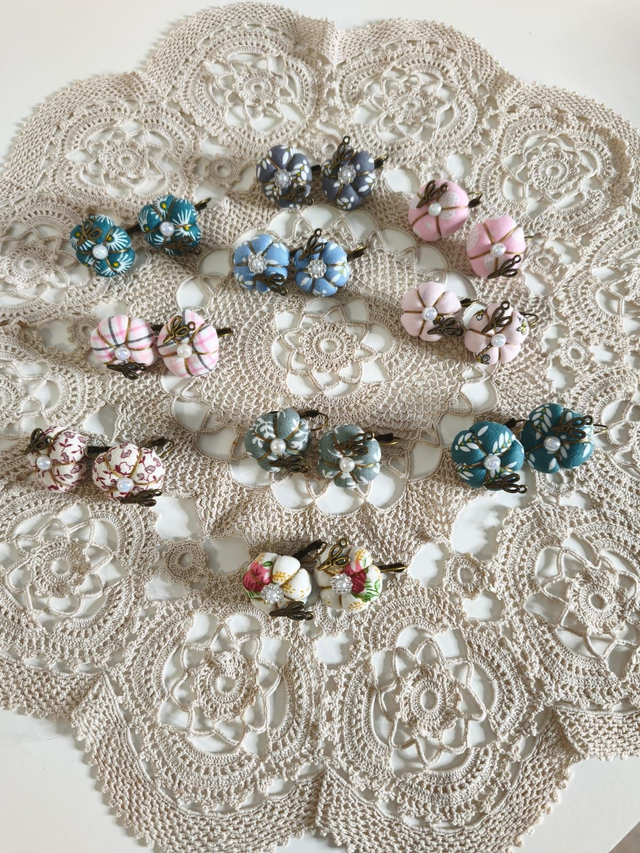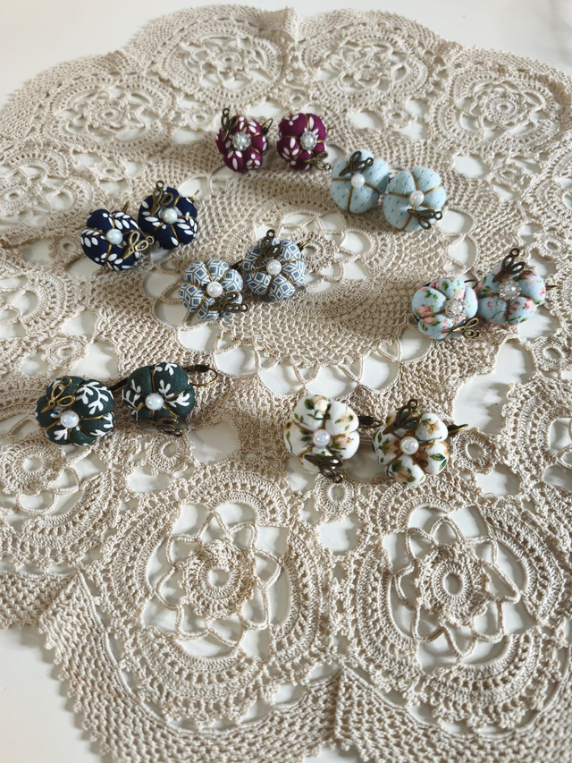Par de brincos com motivos de costura.