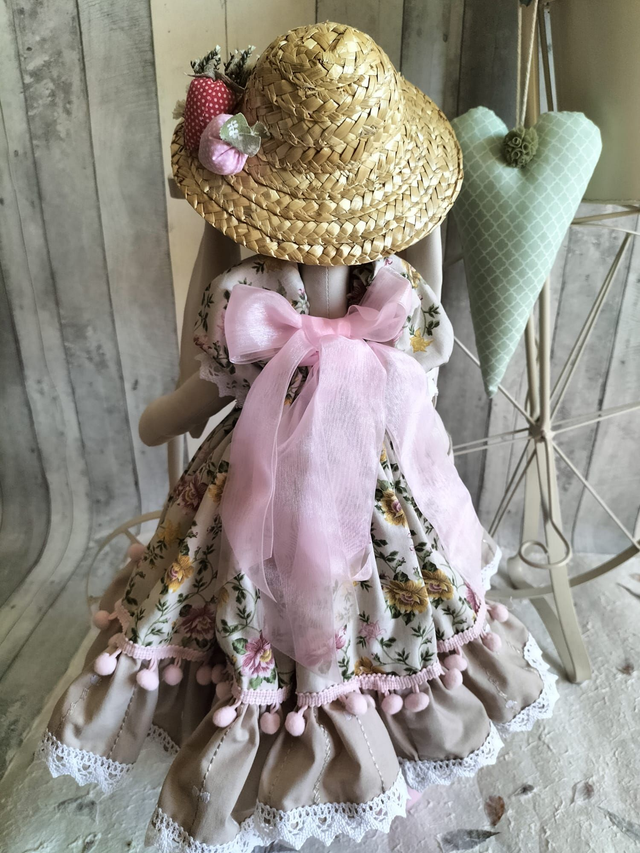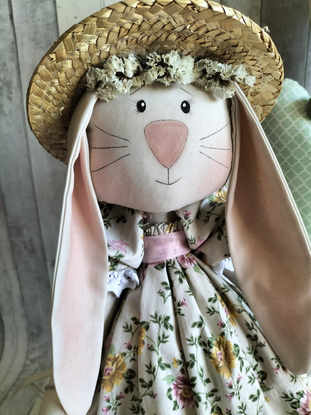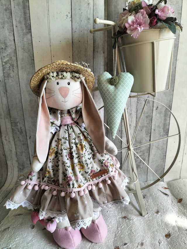 Peça artesanal criada com todo o cuidado e atenção aos detalhes. Esta Coelha Maria é feita com tecidos de algodão, rendas decorativas e o rosto é pintado à mão, destaca-se pelo seu design único e acabamento profissional. Trata-se de um artigo por encomenda; por isso, os tons e padrões dos tecidos poderão variar conforme a disponibilidade. Ideal para decorar e perfeita3 para quem valoriza produtos feitos à mão com qualidade e charme.