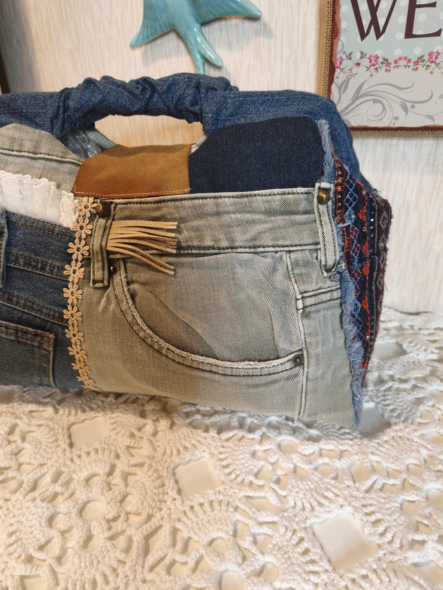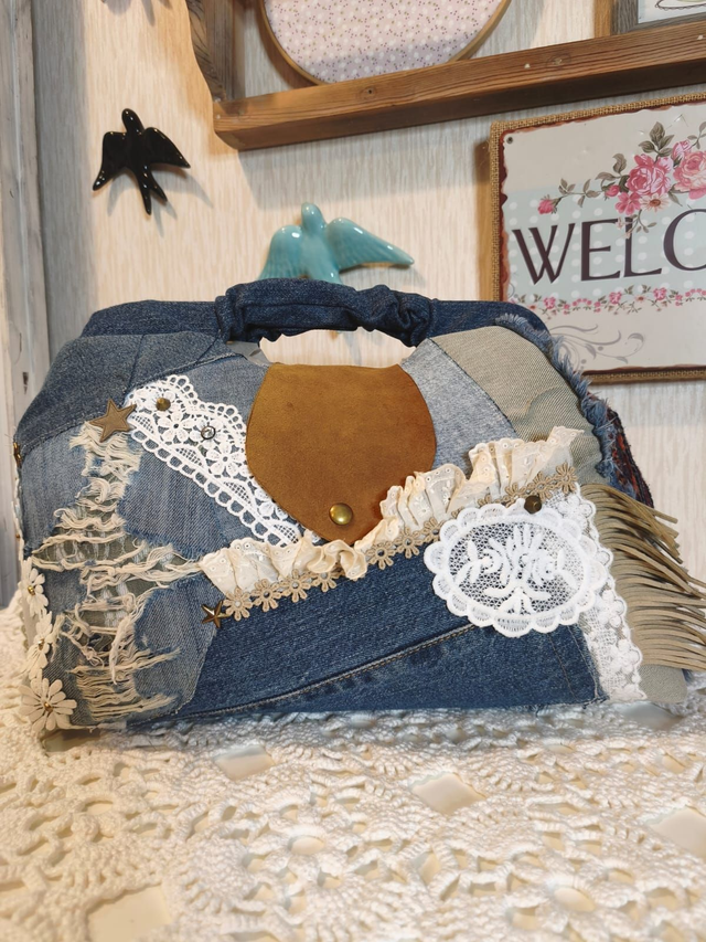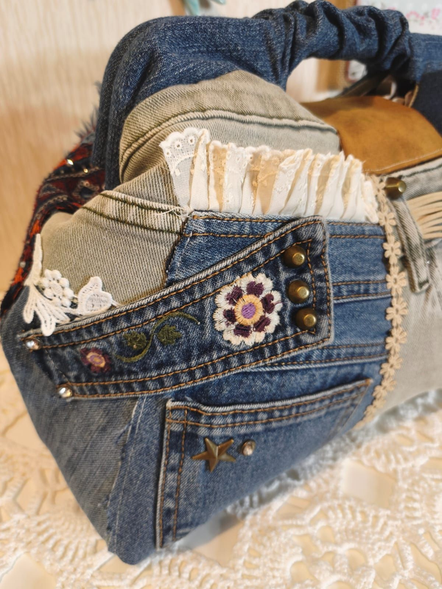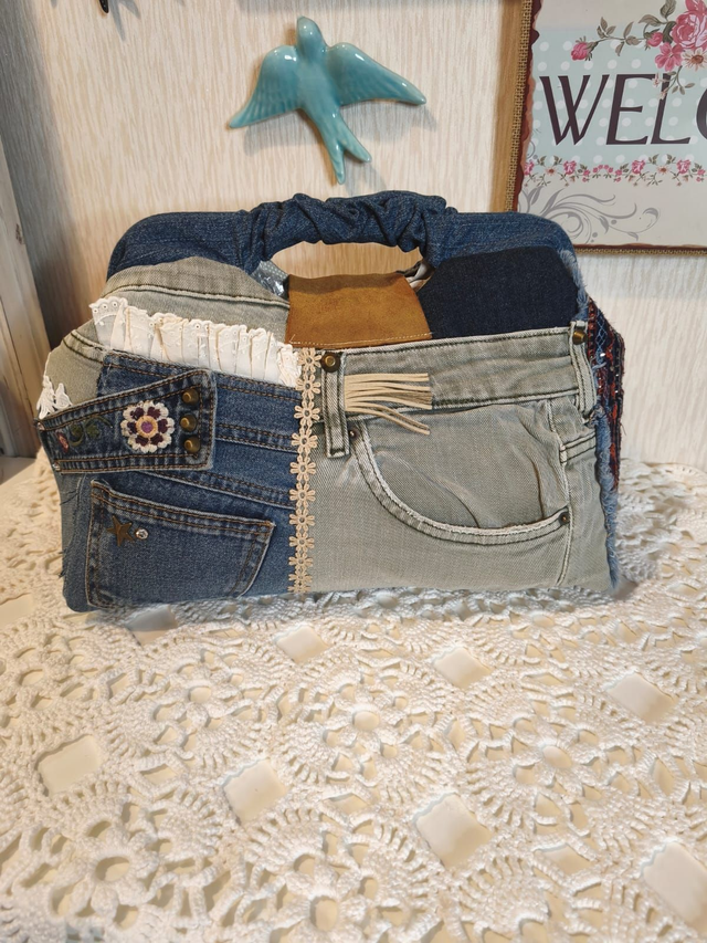 Peça artesanal criada com todo o cuidado e atenção aos detalhes. Esta mala de mão é feita com restos de ganga e destaca-se pelo seu design único e acabamento profissional. Trata-se de um artigo por encomenda; por isso, os tons e padrões dos tecidos poderão variar conforme a disponibilidade. Ideal para o dia a dia e perfeito para quem valoriza produtos feitos à mão com qualidade e charme.